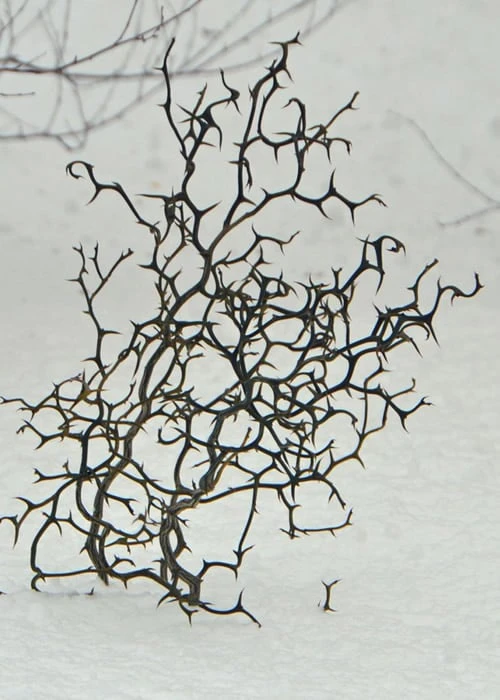 Always an attention-getter with guests who visit our nursery and gardens at any time of year, the Flying Dragon Hardy Orange is sure to be a conversation piece in any garden. Extremely cold hardy to -20 degrees F, this dwarf selection is especially attractive during the winter months when its deep green contorted stems that twist in every direction, huge hook-like thorns, and golf ball sized round yellow fruits are most visible. In early spring, loads of beautiful, citrus-scented white flowers take the stage, contrasting beautifully with the dark stems. Can be grown in garden beds and is especially dramatic in containers. In the ground, Flying Dragon might reach 10 to 12 feet tall over time…a very long time…but in containers is rarely seen over 3 to 4 feet.