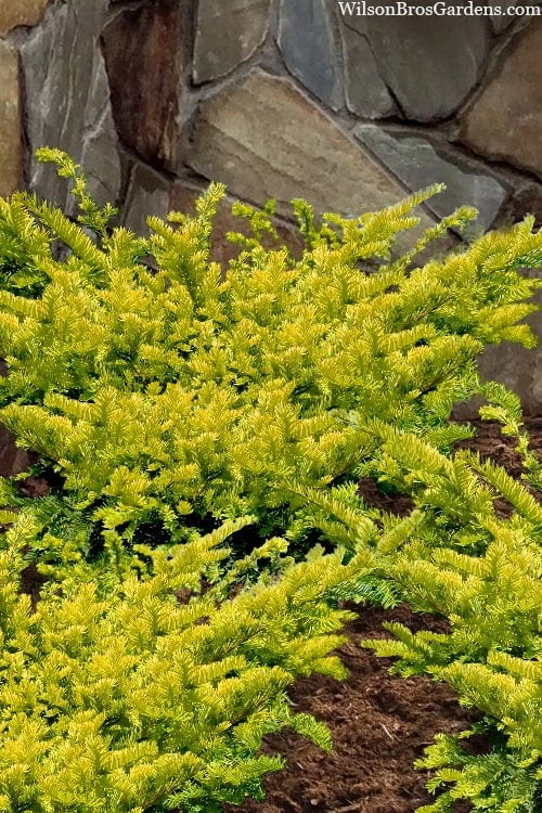 Growing 3.5 to 7 feet tall and 6 to 10 feet wide depending on pruning, the Sunburst Yew is versatile evergreen ideal for use as a specimen, in groupings, or as a natural or clipped hedge. An excellent shrub for home foundation plantings. Looks especially nice around garden ponds or in rock gardens. A fine addition to Asian gardens, rock gardens, yellow theme gardens, tropical look gardens, and conifer gardens.